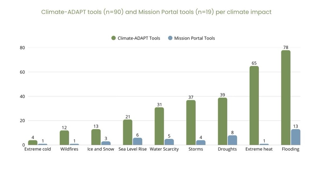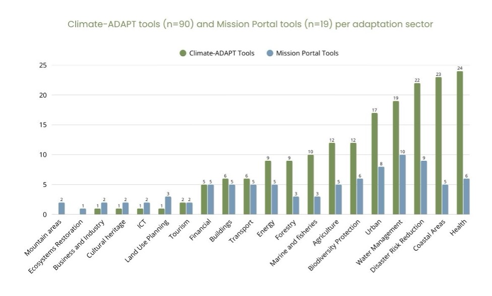 Figure 5- Climate-ADAPT tools and Mission Portal tools per adaptation sector.