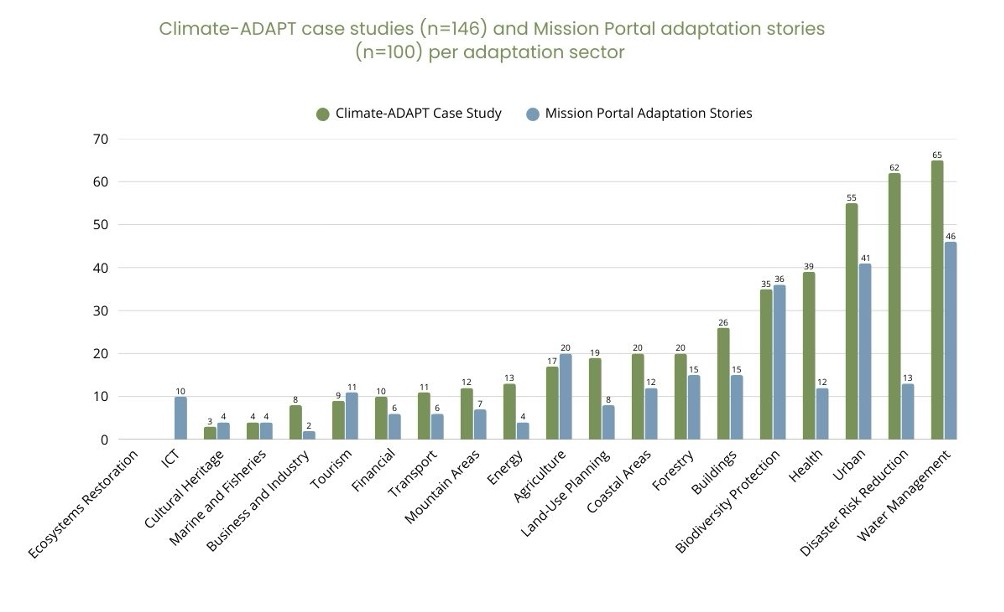 Figure 4- Climate-ADAPT countries and Mission Portal adaptation stories per adaptation sector.