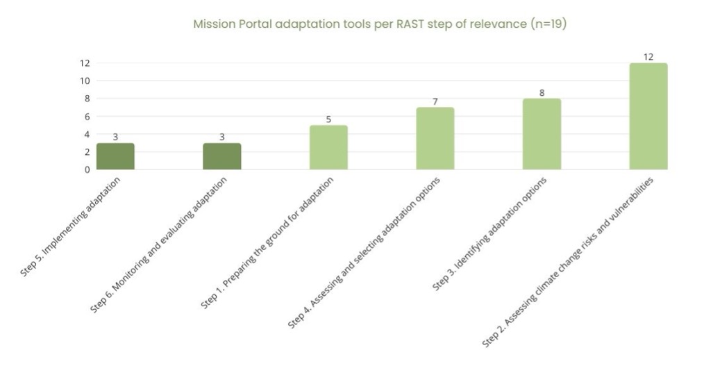 In line with the gaps in Adaptation Approaches from Climate-ADAPT options and tools, the Mission Portal tools database similarly underrepresents the final steps of the adaptation cycle: implementing, monitoring, and evaluating measures in practice (Figure 7).